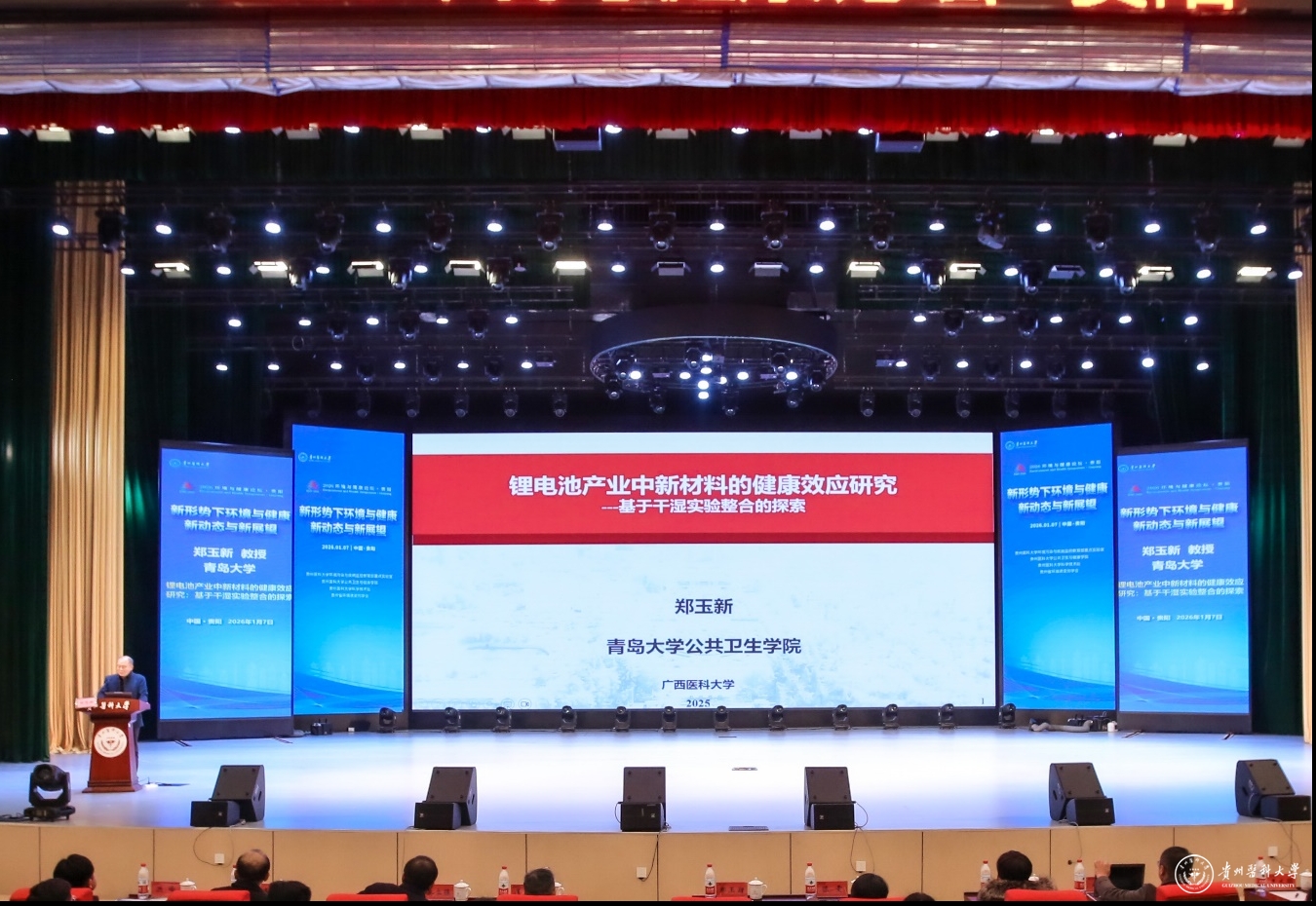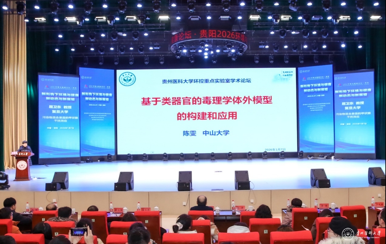1月7日,以“新形势下环境与健康新动态与新展望”为主题的2026年环境与健康论坛在我校云漫湖校区礼堂召开。论坛由贵州医科大学环境污染与疾病监控教育部重点实验室、公共卫生与健康学院、科学技术处及贵州省环境诱变剂学会联合主办,邀请了青岛大学郑玉新教授、复旦大学屈卫东教授、中山大学陈雯教授、苏州大学秦立强教授、西安交通大学张峰教授作专题报告,共同探讨环境与健康领域前沿动态与发展方向。我校师生代表400余人参加了论坛。