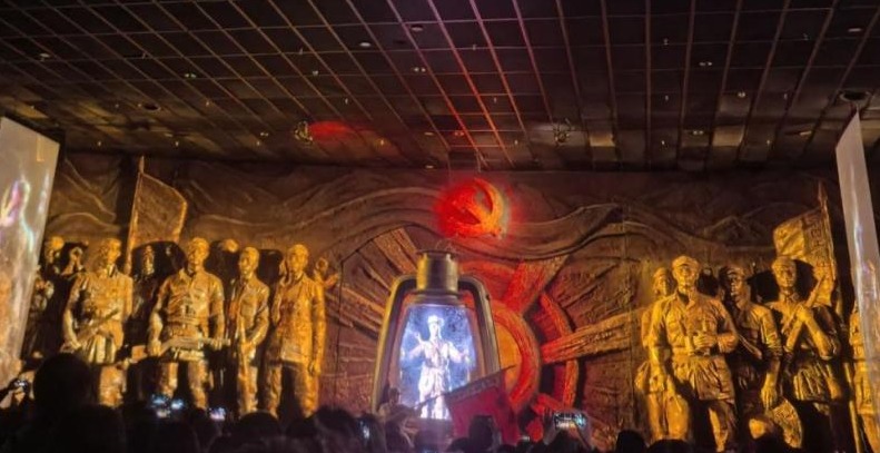 “血火洗礼”篇章中,双曲幕与震动特效交织重现湘江战役的悲壮场景,硝烟气息与枪炮声响营造出沉浸式战场体验,当看到红军战士浴血奋战的画面时,现场学子无不屏息动容。“伟大转折” 展区通过机械结构巧妙切换场景,遵义会议的历史细节清晰呈现,让学子们直观理解 “生死攸关的转折点” 背后的信仰力量。在“砥砺征途”环节,模拟低温环境与实景布置还原了雪山草地的艰险,刺骨寒意中,大家更深刻体会到红军“风雨侵衣骨更硬”的坚韧品格。从“四渡赤水”的军事奇迹到“巧渡金沙江”的机智果敢,六个篇章的沉浸式展演让长征史诗在科技赋能下焕发新生。