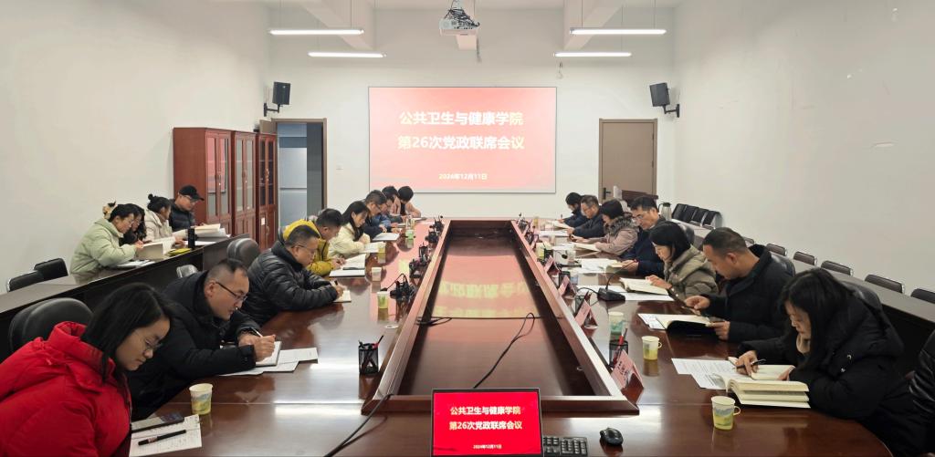 12月11日,公共卫生与健康学院2024年第26次党委会会议、党政联席会议在博雅楼C3组团2-11会议室召开,学校党委副书记、校长罗鹏列席指导,参加“第一议题”学习,听取工作汇报和议题审议,并作现场点评讲话。学校机关纪委书记于炎随行列席旁听。